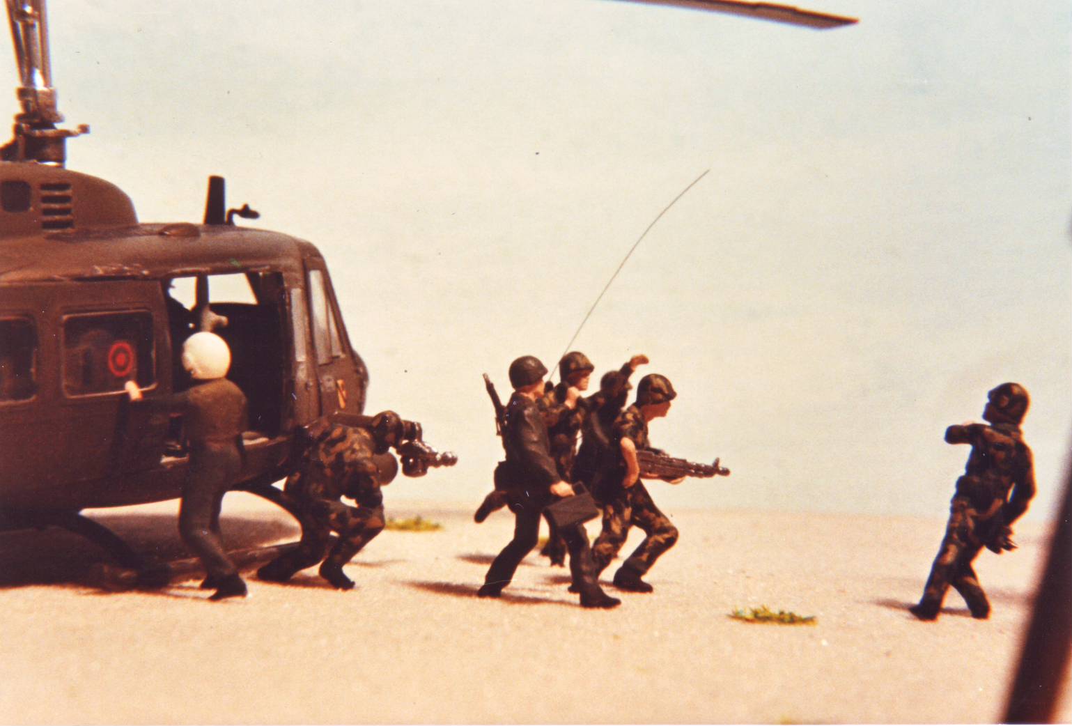 Bei diesem Diorama reizten mich die Figuren, die es so umzubauen galt, dass keine einer anderen Figur glich! Die Bell UH-1D in 1:72 von Italeri bringt Esci-Figuren der 1.US Luftlandedivision an den Strand von Da Nang, Vietnam 1969. Leider sind die Preiser-Palmen nicht im Bild, man sieht nur ihre Schatten. Der Film "Apocalypse Now" lässt grüßen!